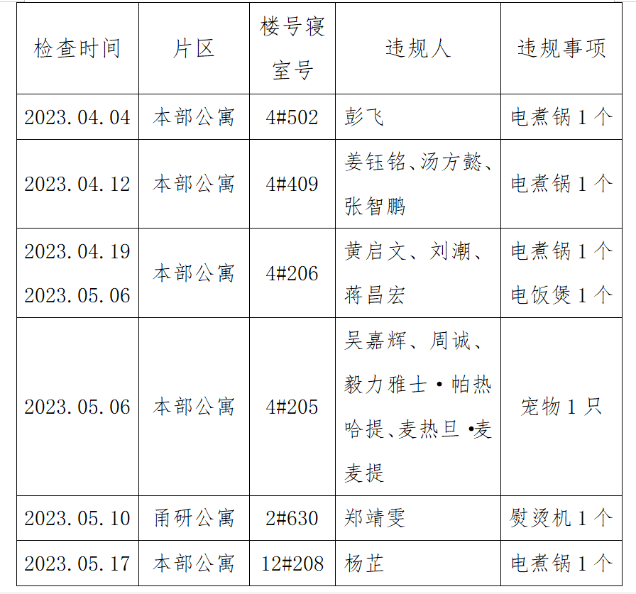 6间寝室有违禁电器情况,根据《宁波大学学生宿舍管理办法(宁大政[2007]104号)》第十二条、第三十三条、第三十四条及《宁波大学学生违纪处分办法(宁大政[2017]114号)》第二条、第四条相关规定,予以院内通报批评。通报名单如下: