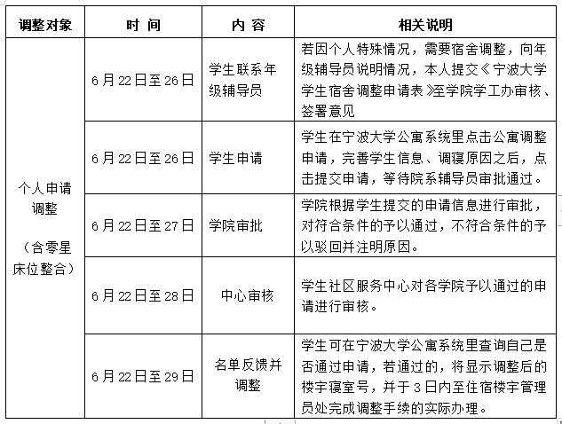 为了认真做好我校2022年寝室调整工作,根据《宁波大学学生宿舍管理办法》(宁大政字〔2007〕104号)和《学生社区宿舍调配、调整管理办法》,为使寝室管理规范化、常态化,现将本学年末寝室调整相关安排通知如下,原则上学年中不受理。