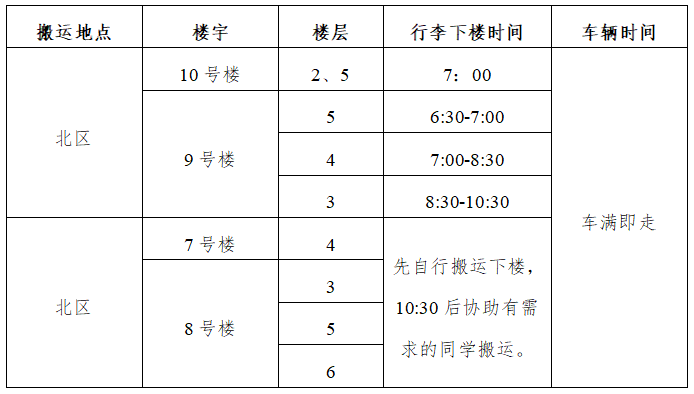 安排搬家公司师傅进楼,协助行李搬运。请所有同学务必提前打包好行李物品,化零为整,把握好时间进度。