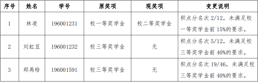 根据2020-2021学年本科学生奖学金评定工作,依据《宁波大学本科学生奖学金评定办法》(宁大政〔2018〕84号)的相关规定,对皇冠体育博彩官网 2020-2021学年本科生学校奖学金拟推荐名单进行变更,具体如下: