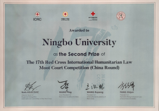 共同主办。凭借高质量的书状、精彩的庭辩表现,宁波大学代表队经过激烈角逐,从60余支代表队中脱颖而出,晋级口头辩论环节,最终与北京大学、西南政法大学、南京大学等高校同获大赛全国二等奖。