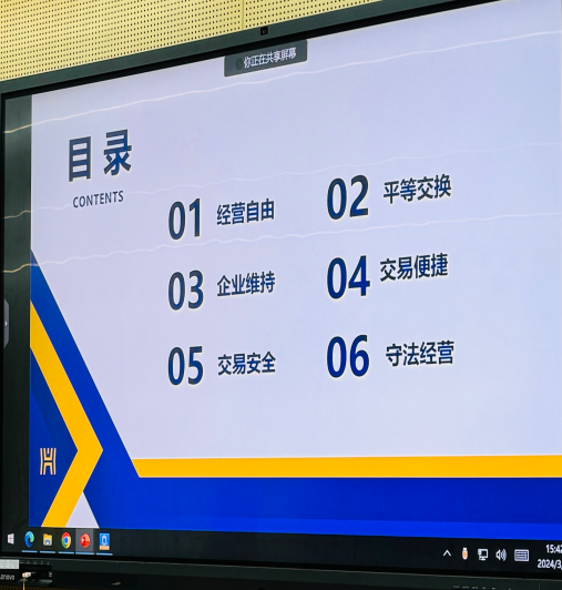 本次专题“商法原则的实务适用”,是围绕《商法总论》第三章商法的价值、理念和适用为知识点展开的实务授课,内容主要涉及经营自由、平等交换等商法基本原则在实务中具体表现。胡律师以主办的案例为蓝本,生动丰富地阐述了法律理念和原则在法律实务中的无形适用,同时为同学们带来了具有挑战性的实务演练题。