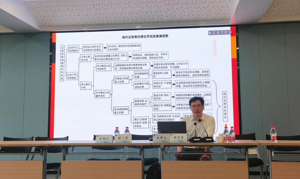 胡教授首先从证明责任产生的原因开始讲解,指出客观证明责任问题存在于任何国家任何时期的诉讼制度中,但这一论断并不适用于古代中国。在古代案件事实存在真伪不明时法官可以拒绝裁判,也可以采用“情节推理”的方式断案。但在现代社会,案件事实存在真伪不明时法官不得拒绝裁判。为此,1883年德国学者首次提出“客观证明责任”,开启了“现代证明责任”理论的研究。