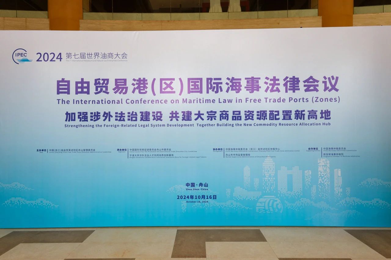 2024年10月16日,2024自由贸易港(区)国际海事法律会议在舟山财富大酒店成功举办。本次会议由中国(浙江)自由贸易试验区舟山管理委员会主办,舟山市贸促会、宁波大学涉外法治人才协同培养创新基地共同承办,中国海仲(浙江)自贸区仲裁中心、舟山市市场监督管理局协办,同时得到了中国海事仲裁委员会、新加坡海事仲裁院的大力支持。中国海事仲裁委员会副主任李虎、舟山市委副书记梁雪冬出席并致辞。来自中外政府机构、国际组织、贸促系统、行业商协会、高校、律所等机构及航运、物流、船舶等200余人现场参会,线上参会人数近6万。