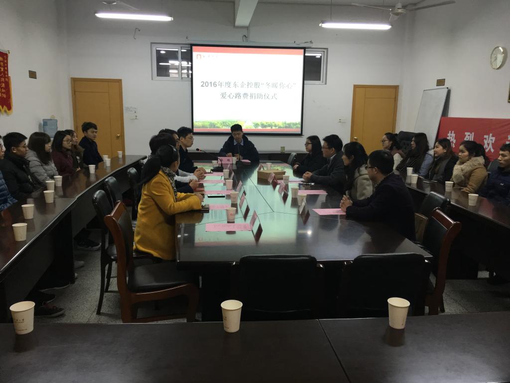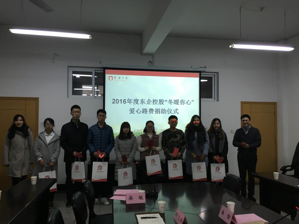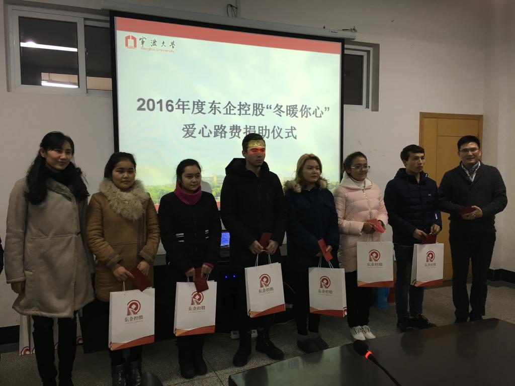 据悉, “传递爱心 温暖你心”活动是“东企控股爱心基金会”资助宁波大学学生的一个爱心奉献活动,始于2012年。本年度共捐资10000元,为20名在外求学的学子提供归途路费。东企控股希望通过该爱心活动,给学子们再春节来临之际送去一份温暖和动力,希望他们在关爱中成长成才,同时号召各方有志之士注重回馈社会,承担应有的社会责任。