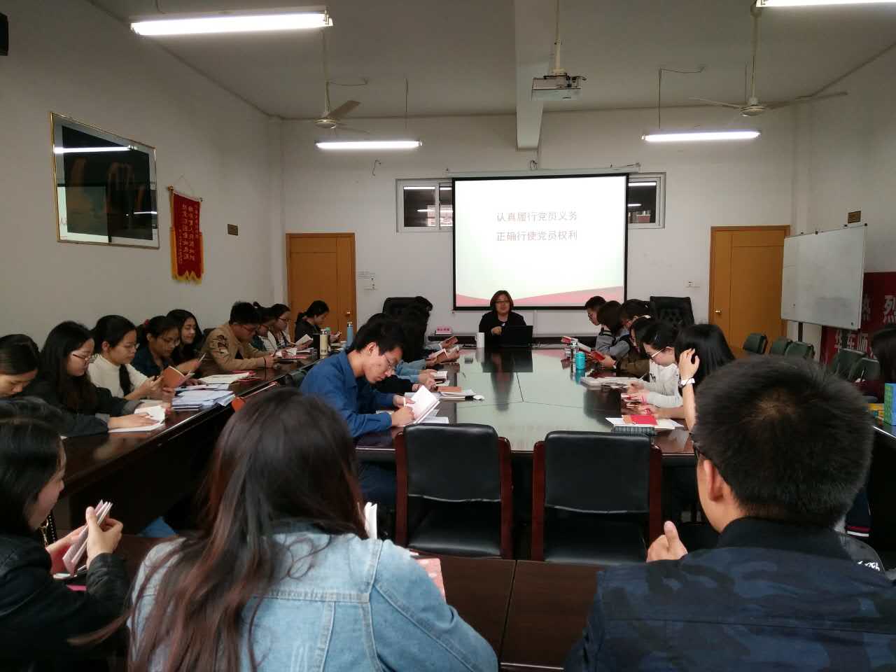 会议室为第三十四期入党积极分子主讲“中国共产党的义务和权利”为主题的党课。