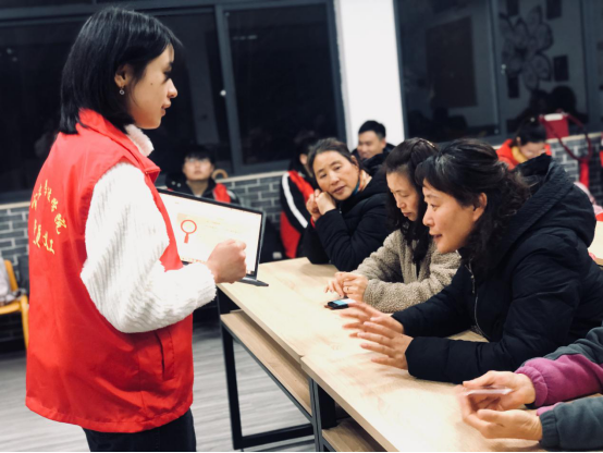 学生党员发挥自身专业优势,在村逸夫文化大礼堂向村民普及个人信用知识。