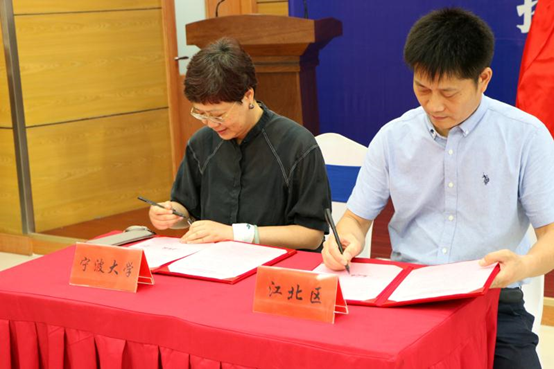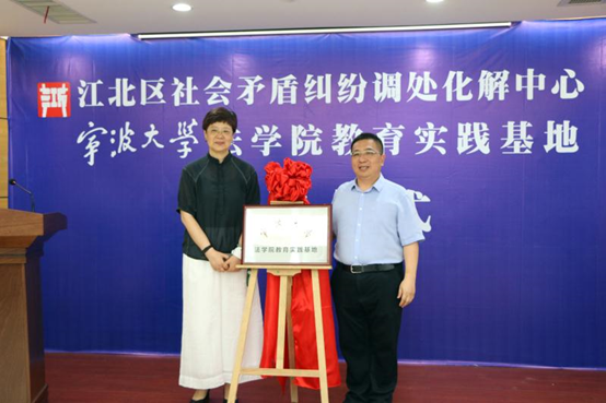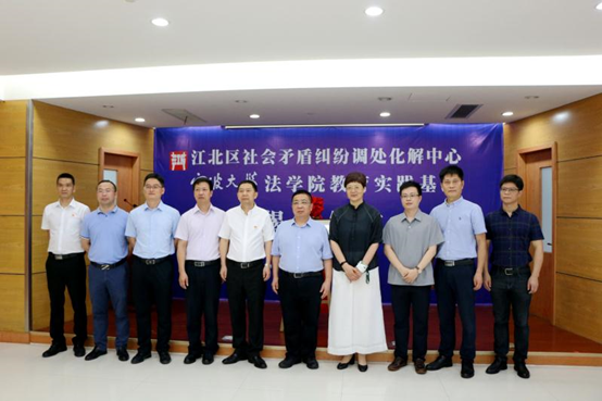与江北区矛调中心党组书记、主任黄前潮签署教育实践基地协议,并与江北区委副书记、区委政法委书记张飞宇共同为教育实践基地揭牌。