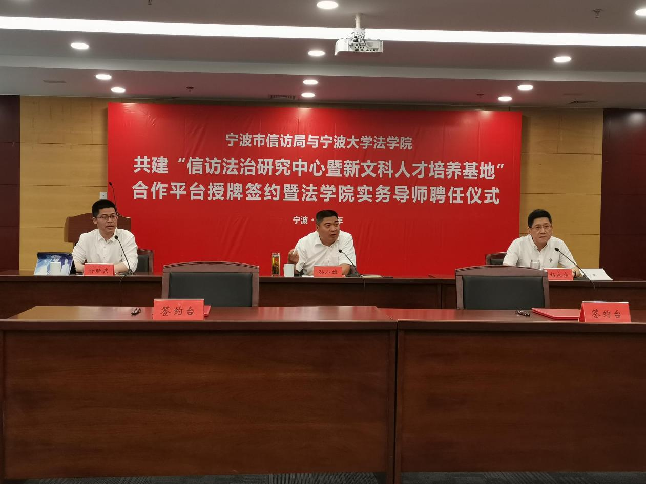 与宁波市信访局共同举行双方共建的“信访法治研究中心暨新文科人才培养基地”合作平台签约揭牌仪式。由市信访局信访督查专员杨永宗主持。市委副秘书长、信访局局长孙小雄,市信访局办公室、综合指导处、办信处、接访处、督查处、复查复核处等处室处长、皇冠博彩-皇冠体育博彩官网
