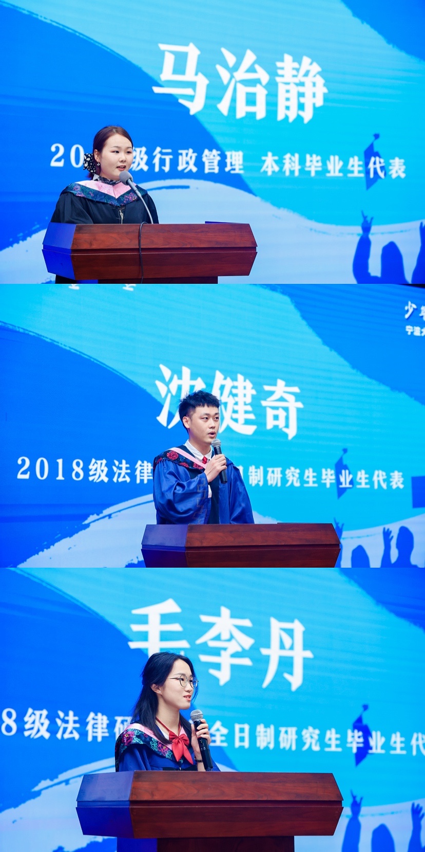 接着,本科生毕业生代表马治静、全日制研究生毕业生代表沈健奇、非全日制研究生毕业生代表毛李丹分别上台致辞,感谢母校的栽培,感谢恩师的教导,回忆同窗的点滴,并表示会继续努力,为皇冠博彩