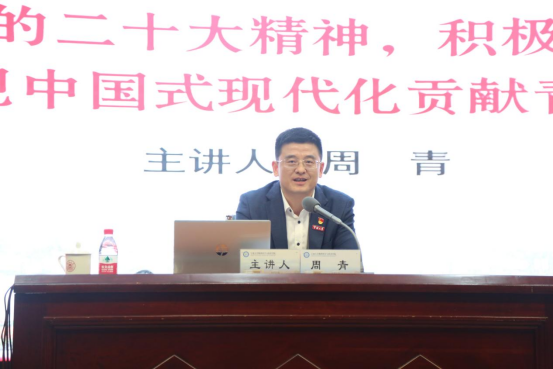 11月16日,校党委委员、党委宣传部部长周青在真诚图书馆报告厅以“深入学习党的二十大精神,积极投身创新创业,为实现中国式现代化贡献青春力量”为题为皇冠体育博彩官网