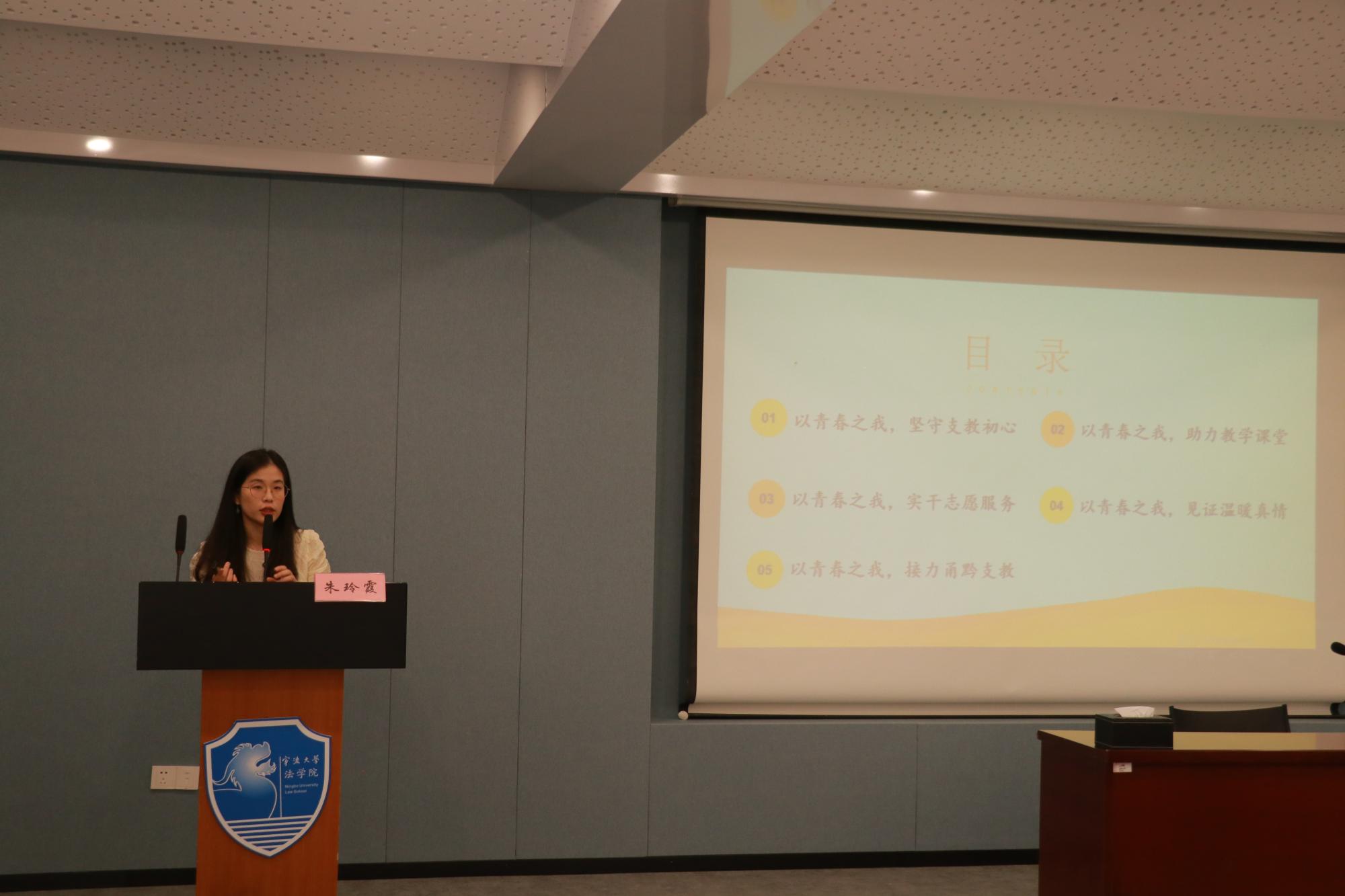 接下来是朱玲霞用图文及视频结合的方式,生动地展示了她在贵州省黔西南州兴仁市第七中学的支教生活。从朱玲霞同学的话语和图片中可以了解到,尽管她当时教近200个学生,备课与上课节奏非常紧凑,假期也很少,她依旧认为能够来到贵州支教,认识一群可爱的学生,是一件充满幸福和快乐的事情。随后朱玲霞同学还对宁波大学关于学生参与基层支教队伍的要求及保障做了简洁明了的解读,帮助有需求的同学们更加深入地了解相关政策。