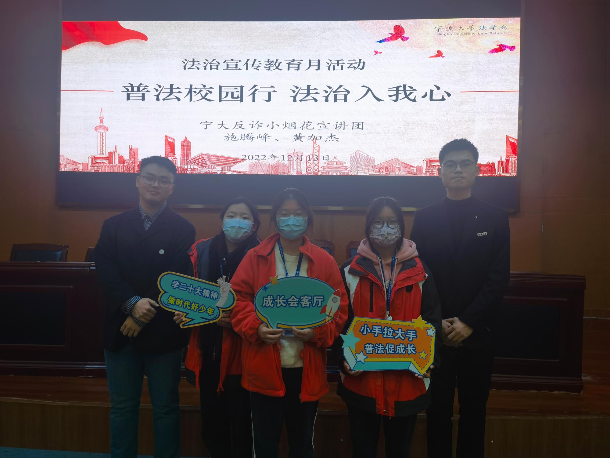 本次讲座由宁波大学青年普法宣讲团——“宁大反诈小烟花”团队的21级法律硕士黄加杰、梁蔚程以及22级法律硕士施腾峰、王富达进行主讲,他们以“普法校园行,法治入我心”为主题,通过“法律实践与法治理论相结合”、“公民权利与时代使命相呼应”、“分享与互动相配合”的方式进行普法宣讲。